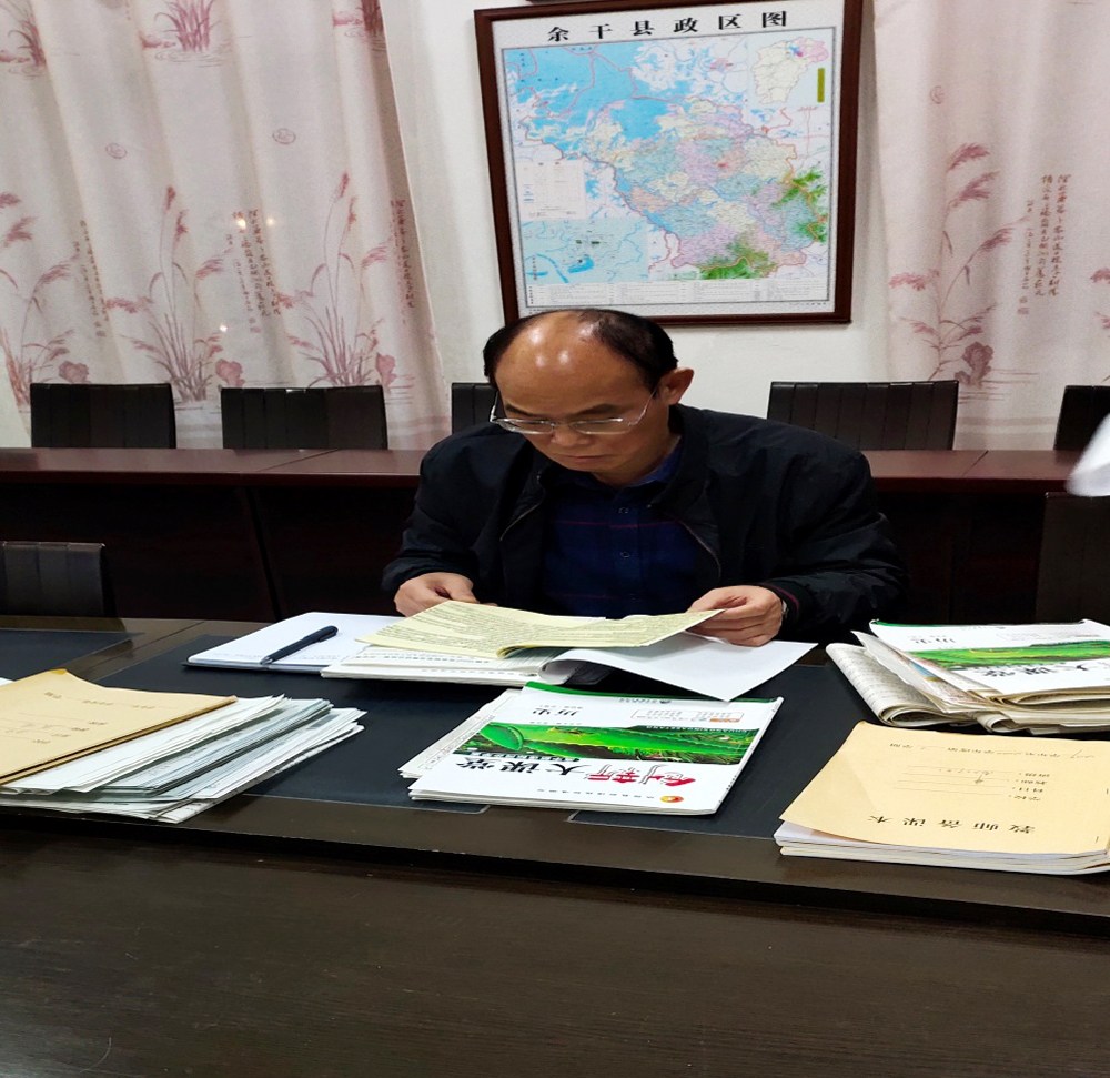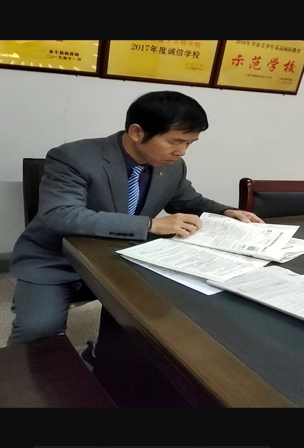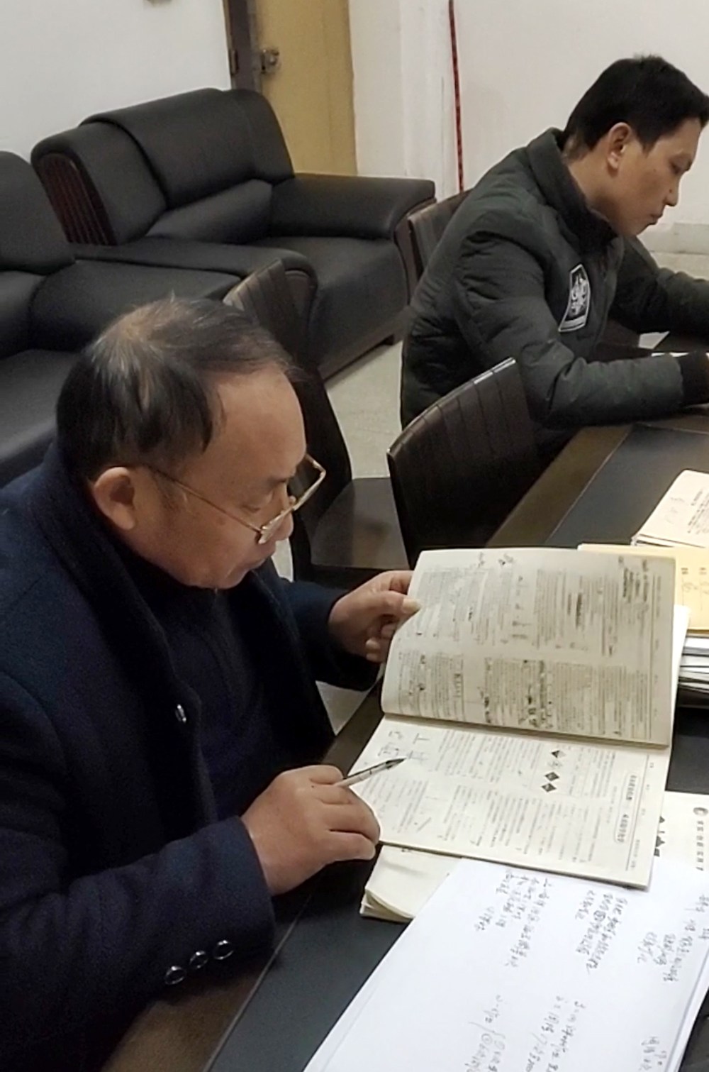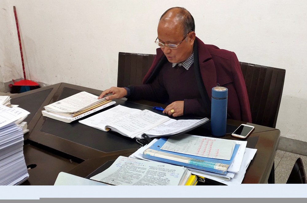 教导主任方作钦(左1)检查教案就好像高考那般认真呢!